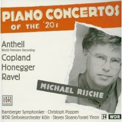 二番目はアンタイルのジャズ・シンフォニー。コープランドとガーシュウィンに大絶賛されたらしい割には全く目立たないアンタイルさん。代表作「バレエ・メカニーク」のピアノはコープランドがやったらしいですがそんなもの聞ける金なんてある訳もなく(ナクソスで一枚出てました)。仕事の締切に二年遅れた挙句の初演が(当時の)オール・ネグロ・オーケストラというところから既に曰く付き感はマックス(その間に一山当てたのが後述のガーシュウィンのピアノ協奏曲というわけです)。大穴博打当て作曲家って印象は拭えないですが、でもなかなか。中身は第一巻の「ピアノ協奏曲第一番」と同じで、アメリカ音楽特有の甘ったるさと六人組の無条件の(ぎらぎらと毒々しい)幸福感を混合させた感じ。ガーシュウィンはストラヴィンスキーとフランス人のフォロワー的な作品だと書いているらしいですが、まさしくそんな感じ。ミヨー初期の怪しさも混じってるのかなあ。そしてびっくりするぐらい「どこがジャズだよ!」な感も拭えません。同じような主題を幾度となく反復された挙句、ショスタコーヴィチばりのあやすぃ弦の使い方も「うぎゃあ」ってなる感じ。と思えば弱音器付きのトランペットはゴツク歌ってらっしゃって死ぬ程すてきだし、「いい加減にしろよ!」ってぐらいしつこく続くピアノと弦の裏打ちも何だか笑えてくる。そこにまた弦がちゃかしに入ってくる一方、ピアノはおっとろしくシリアスな顔付きで打鍵……何ちゅう音楽だ。キチガイスレスレというか、成程そりゃガーシュウィンやコープランドみたいな解りやすさとはかけ離れまくり。コープランドのピアノ協奏曲なんてわかりやすいバカっぷりに徹してる分何も考えず「いえーい」と楽しめたりしますが、こいつあキチガイだぜ! っていう。と思えばガーシュウィンのピアノ協奏曲から丸々引用されたり、お前はアメリカのショスタコーヴィチですか。これを知的と呼ぶべきかどうかは私には全く解りませんが、まあ愛すべきキチガイ作曲家とだけは。最後までガーシュウィンの主題をパロディするあたりもうどうしようもない。ただ盛大に笑える音楽という点では物凄く有用でしょうか(笑)。うーん、食えない奴です。ある程度エンターテイメントに徹してるシュルホフより「わかりやすさ」を装うお前の方がよっぽど怖いわ! キチガイ一直線のヴァレーズよかよっぽど怖い人間が居たんだまったく。エンターテイメントとして楽しめるか否かと言えば、前出のピアノ協奏曲の方がよっぽど親しみやすいですね。こっちは毒っ気が強過ぎてなかなか……。